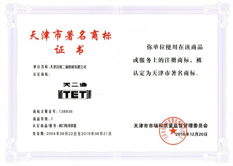 天津市著名商標證書