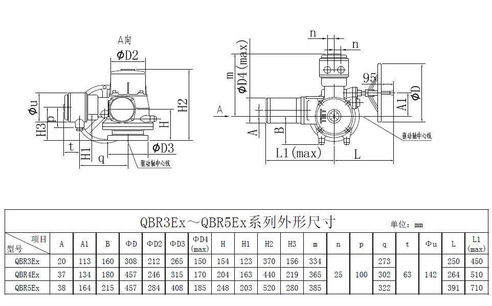 QBR3QBR5是我公司研制的部分回轉(zhuǎn)閥門電動(dòng)裝置,控制轉(zhuǎn)矩范圍:900N.m12000N.m。該電動(dòng)裝置可與球閥﹑蝶閥等閥瓣做90°回轉(zhuǎn)的閥門組合成電動(dòng)閥門,其功能是控制閥門的啟閉。該電動(dòng)裝置能夠進(jìn)行單機(jī)或多機(jī)室內(nèi)控制遠(yuǎn)距離控制電動(dòng)操作和現(xiàn)場(chǎng)手動(dòng)或電動(dòng)操作,可廣泛地應(yīng)用在具有管道閥門的工業(yè)系統(tǒng)。該產(chǎn)品的防護(hù)等級(jí)為IP67,隔爆型產(chǎn)品(型號(hào)中有Ex)的隔爆等級(jí) 為dBT4