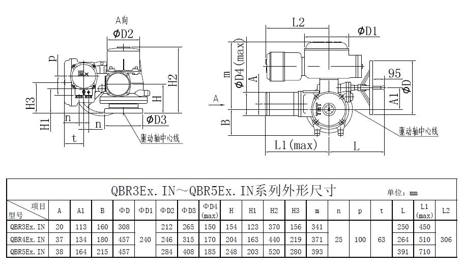 QBR3~QBR5是我公司研制的部分回轉閥門電動裝置,控制轉矩范圍:900N.m~12000N.m。該電動裝置可與球閥﹑蝶閥等閥瓣做90°回轉的閥門組合成電動閥門,其功能是控制閥門的啟閉。該電動裝置能夠進行單機或多機室內(nèi)控制遠距離控制電動操作和現(xiàn)場手動或電動操作,可廣泛地應用在具有管道閥門的工業(yè)系統(tǒng)。該產(chǎn)品的防護等級為IP67,隔爆型產(chǎn)品(型號中有Ex)的隔爆等級 為dⅡBT4。
