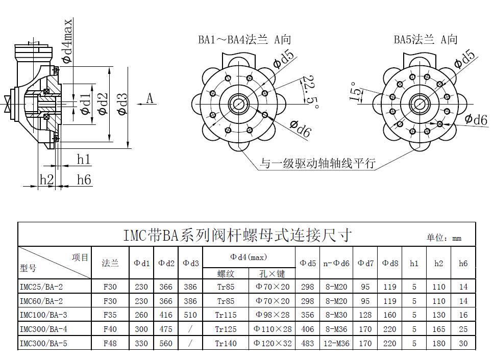 IMC/BA系列閥門電動裝置是一種組合型多回轉(zhuǎn)閥門電動裝置。它適用于閘閥、截止閥等類型的閥門。BA系列產(chǎn)品是可同時承受轉(zhuǎn)矩和軸向推力(通常稱為扭矩推力型)的圓錐齒輪閥門驅(qū)動裝置。其傳動型式可以滿足右旋手動操作閥門為“關(guān)”的標(biāo)準(zhǔn)要求,結(jié)構(gòu)緊湊且大圓錐齒輪便于設(shè)置內(nèi)部有一定直徑的貫通孔輸出軸,可使明桿閥門的閥桿在開啟時從輸出軸的內(nèi)孔伸出。BA系列產(chǎn)品可與中小轉(zhuǎn)矩規(guī)格的多回轉(zhuǎn)電動裝置組合成為較大輸出轉(zhuǎn)矩規(guī)格的組合式多回轉(zhuǎn)閥門電動裝置。