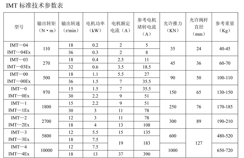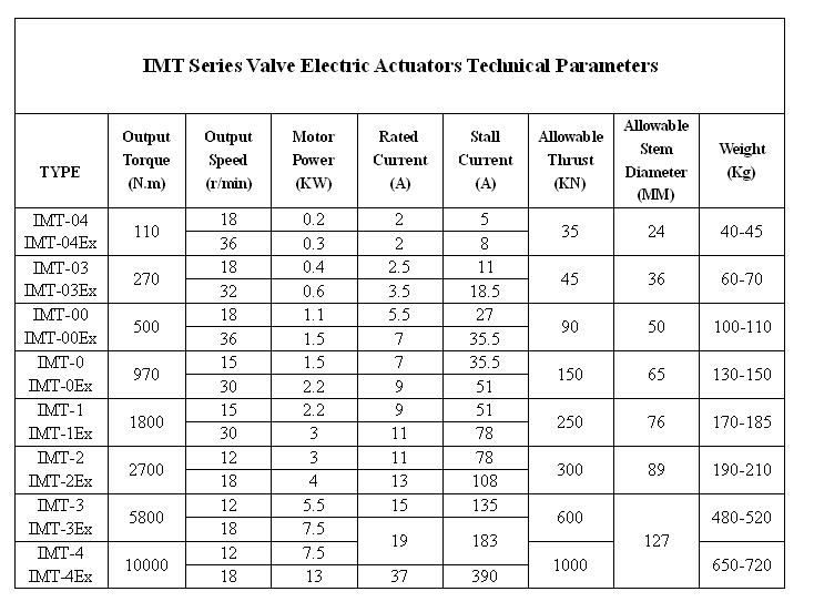 Multi-turn intelligent valve electric actuators--IMT series are generally used to gate valves , stop valves ,diaphragm valves and rod multi-turn valves to move straight forwards. IMT series and its derived products are extensively used in petrochemical, matallurgy, energy sources, municipal, light industry, food and other fields. This series plays a significant role in pipeline control system.