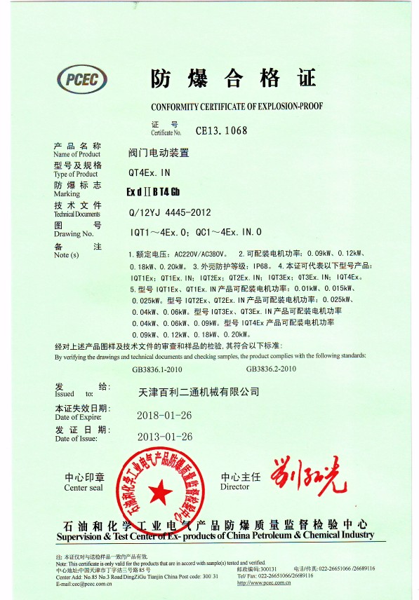 QT1~QT4 quarter-turn valve electric actuators are upgraded products developed by our company. They are applicable for controlling valves that make 90 degree turn, such as butterfly valve, ball valve and plug valve etc. The products have features like small size, light weight, high efficiency, high reliability, high protective property and low noise etc. The products can be operated on local place or controlled remotely. The protective grade of the products is IP67 and the explosive-proof grade is ExdIIBT4